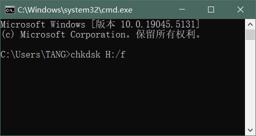其中,H:是卷標(biāo),/f是修復(fù)發(fā)現(xiàn)的錯(cuò)誤,如果寫/r是查找壞區(qū)并恢復(fù)可讀信息,chkdsk是check disk的意思。